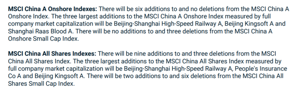 Msci调整预测:哪些股票可能符合纳入条件?msci季度调整:预计相对平淡;初步筛选5只股票或符合纳入条件 msci将于北京时间8月13日凌晨公布其定期的常规季度指数调整结果。中国半年度调整:新增56只、剔除 45只(2020.05.13) 市场策略| msci中国季度调整:新增6只、剔除2 只(2020.02.13) 市场策略| msci指数. Msci指数季度调整生效 明阳智能等成新增a股标的 2021年05月28日22:13 消费日报网 新闻爆料:finance@china.org.cn 电话:(010)82081166 本次调整中,msci全球标准指数新增23只个股,其中包括 金龙鱼 、 农夫山泉 (港股)、 理想汽车 (美股)等14只中国股票;同时移出8只个股,其中包括 华测检测 、 河北建设 (港股)等3只中国股票。